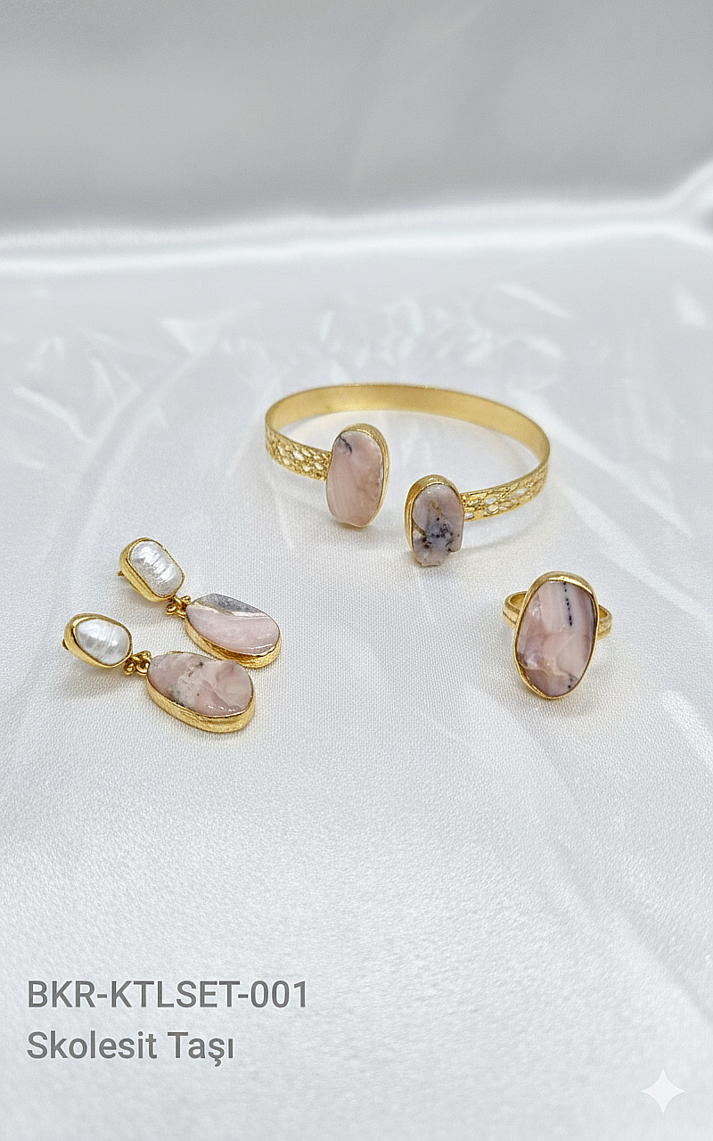Skolesit Taşlı Altın Kaplama Bakır Takı Seti (Küpe, Kelepçe, Yüzük)