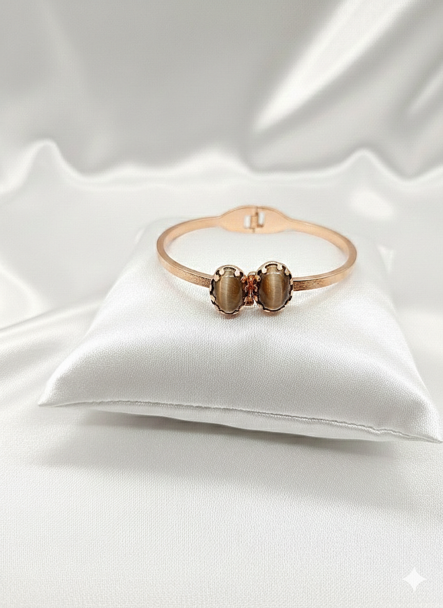 Zarafeti ve koruyucu enerjiyi bileğinizde taşıyın! Modern tasarımıyla öne çıkan bu çelik kelepçe, kedigözü taşının büyüleyici ışık oyunları ve bakır kaplamanın vintage şıklığı ile birleşiyor. Hem günlük kombinlerinize eşlik edecek bir stil parçası hem de ruhunuza hitap edecek bir enerji kaynağı.